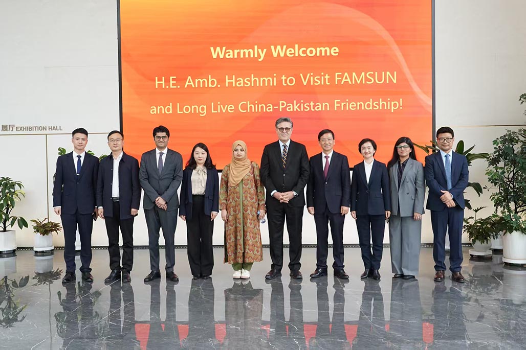 During his visit to FAMSUN, Ambassador Hashmi and his delegation were received by its President Chen Zhengjun. President Chen briefed them on the company’s state-of-the-art Smart Park which seamlessly optimizes resources, energy consumption, and ecological sustainability. The Ambassador appreciated FAMSUN’s growing footprint in Pakistan and encouraged the company to further expand partnerships in agricultural modernization, agro-processing, dairy products, and capacity building.